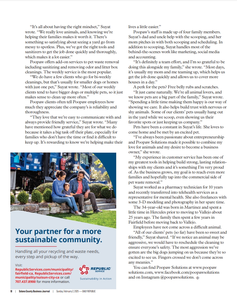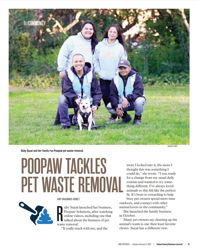 Poopaw Solutions was recently featured in the Daily Republic’s Business Journal! 🎉 A huge thank you to Amy Maginnis-Honey for giving us the opportunity to share our story and journey in the pet waste removal industry and highlight the work we do to keep yards in Vallejo and surrounding areas clean, safe, and poop-free!