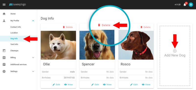 You can add a new dog, remove a dog, or update existing dog details on the Dog Info tab. It’s crucial to indicate whether it’s safe for our tech to be in the yard with your dog.