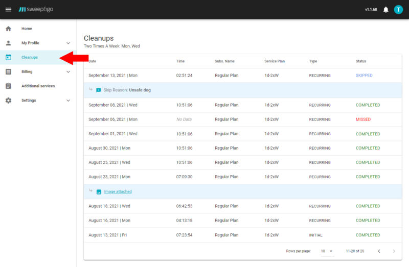 The Cleanups section shows information about completed, skipped, or missed cleanups, including the date and time of each visit. You can also use this section to remind yourself of your scheduled service days.